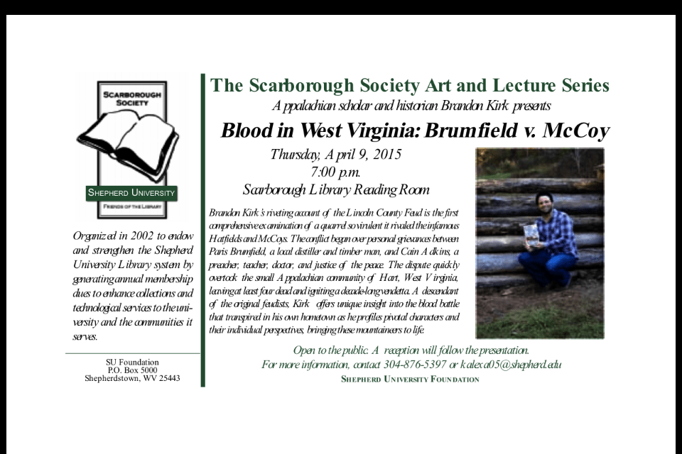 Appalachia, Blood in West Virginia, book, books, Brandon Ray Kirk, feud, history, Lincoln County, Lincoln County Feud, Scarborough Library, Scarborough Society Art and Lecture Series, Shepherd University, Shepherdstown, West Virginia, writing