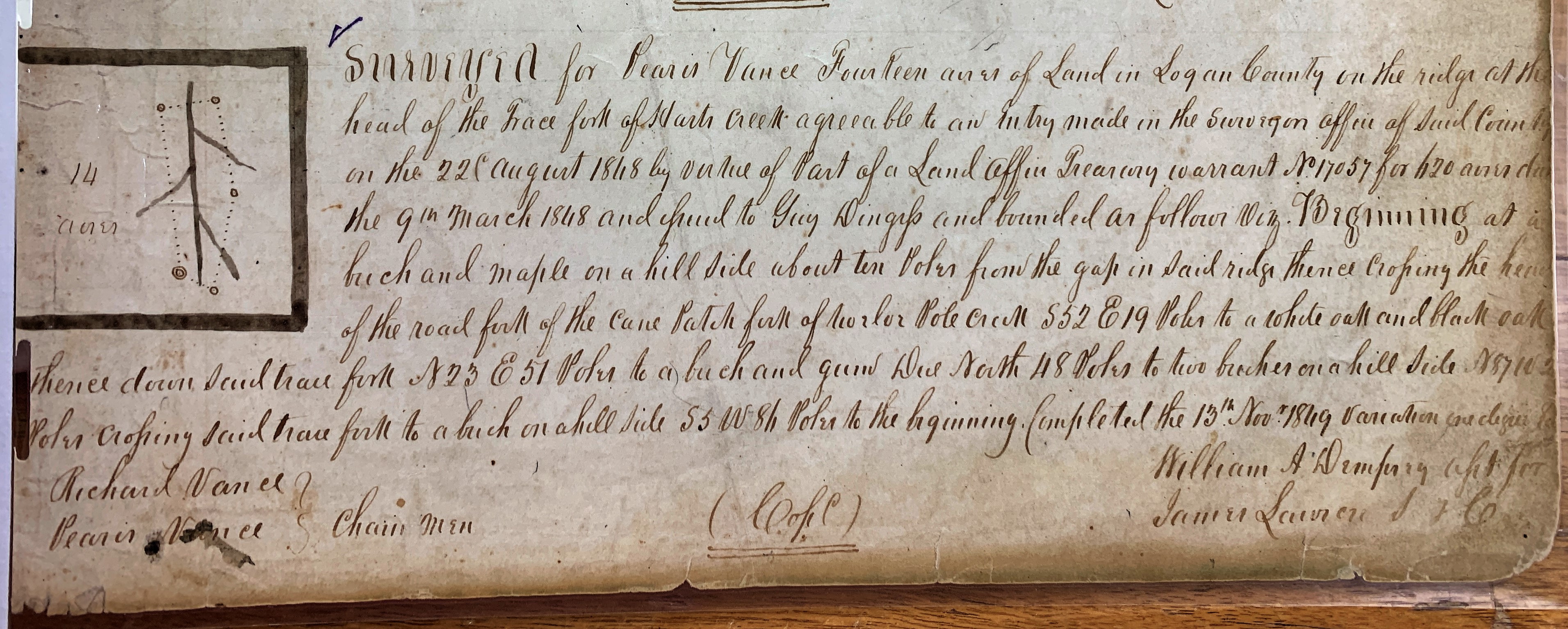 Survey for fourteen acres on Trace Fork of Kiahs Creek and Cane Patch Fork of Twelve Pole Creek in Logan County, VA. Today, this property is located in West Virginia.