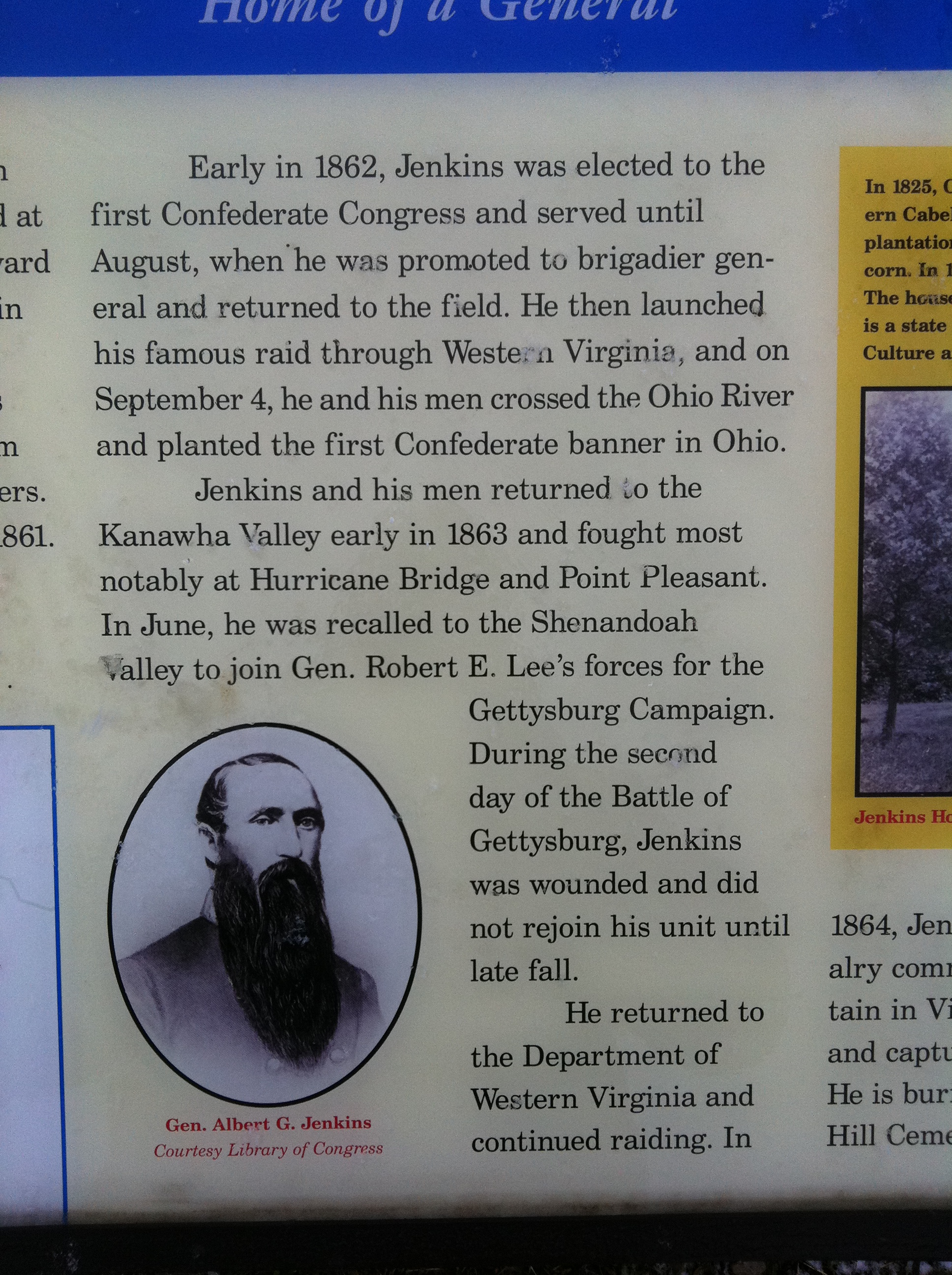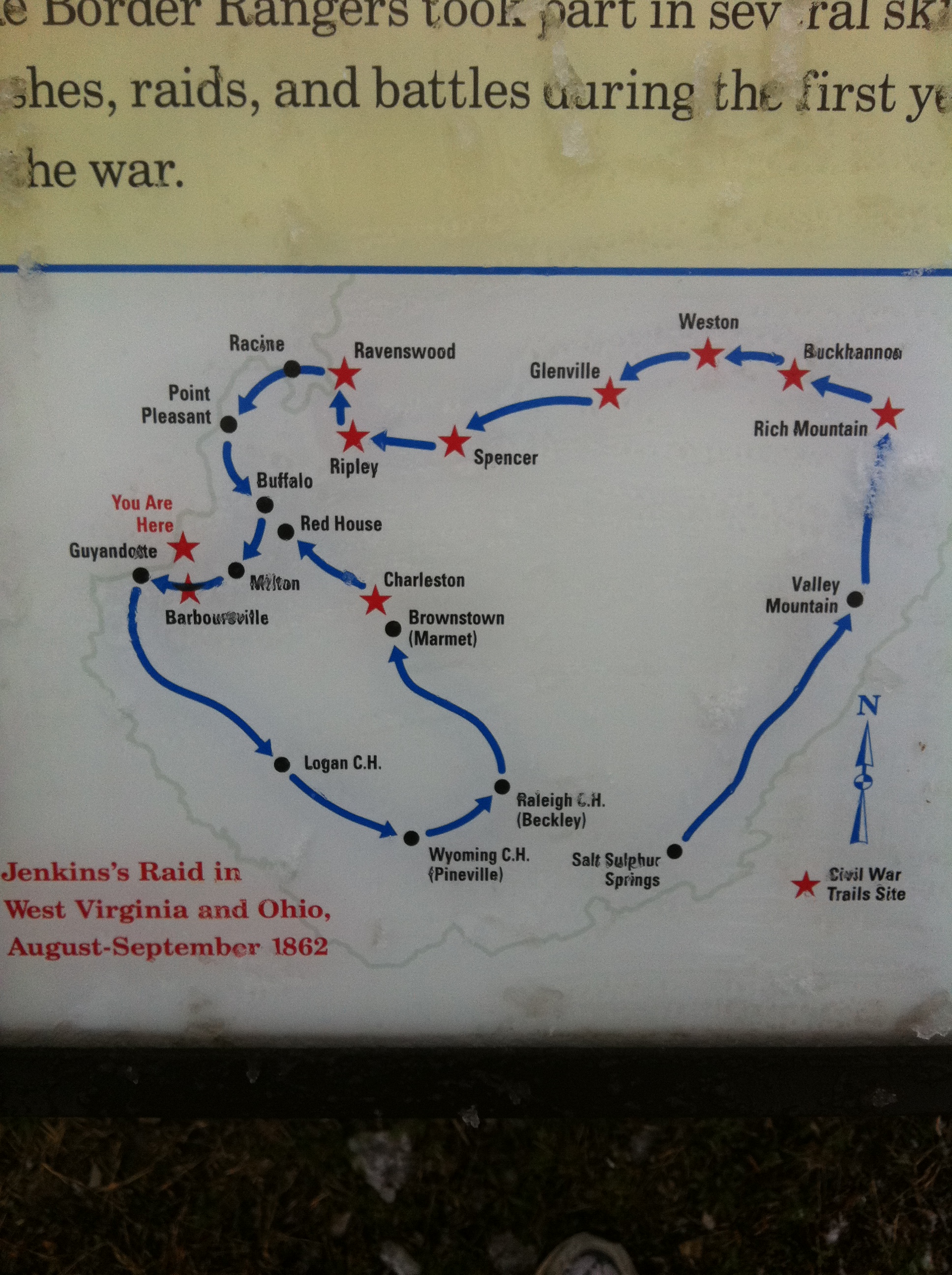 In August 1862 Harrison and the Fairview Rifles got a huge morale boost when they marched with Colonel Jenkins’s force from Monroe County to the Ohio River, occupying the towns of Buckhannon, Weston, Glenville, Spencer, Ripley, and Ravenswood along the way. At the Ohio, Jenkins and about half of his troops crossed the river and captured Racine (they were the first Confederates to enter Ohio) before re-entering (West) Virginia and heading to Point Pleasant.