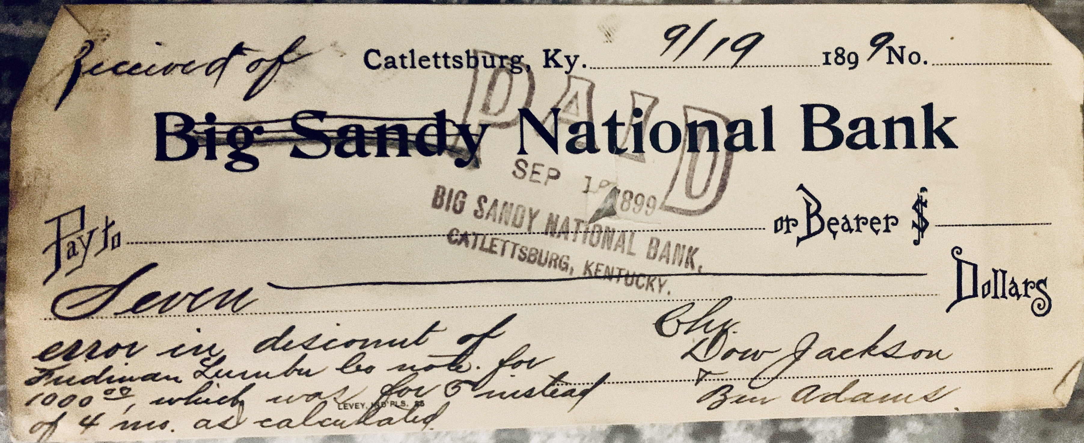 Dow Jackson and Ben Adams, $7.00, Big Sandy National Bank of Catlettsburg, KY, 19 September 1899.